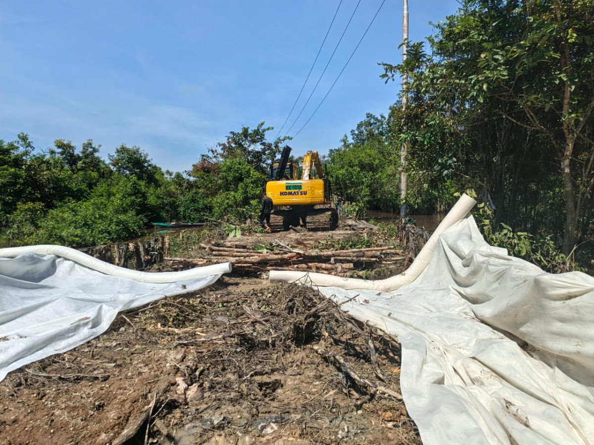 Penggunaan alat berat seperti excavator dan dump truck membantu mempercepat pengerjaan, terutama pada area yang membutuhkan perataan dan pengisian material penimbunan.