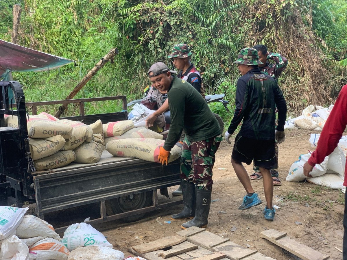 Barito Selatan – Prajurit TNI yang tergabung dalam Satuan Tugas (Satgas) TNI Manunggal Membangun Desa (TMMD) Reguler Ke-124 Kodim 1012/Buntok melansir material semen mengunakan tosa untuk bahan betonisasi jalan sasaran program TMMD yang ada di Desa Talio, Kecamatan Karau Kuala, Kabupaten Barito Selatan, Pada hari Minggu (25/05/2025)