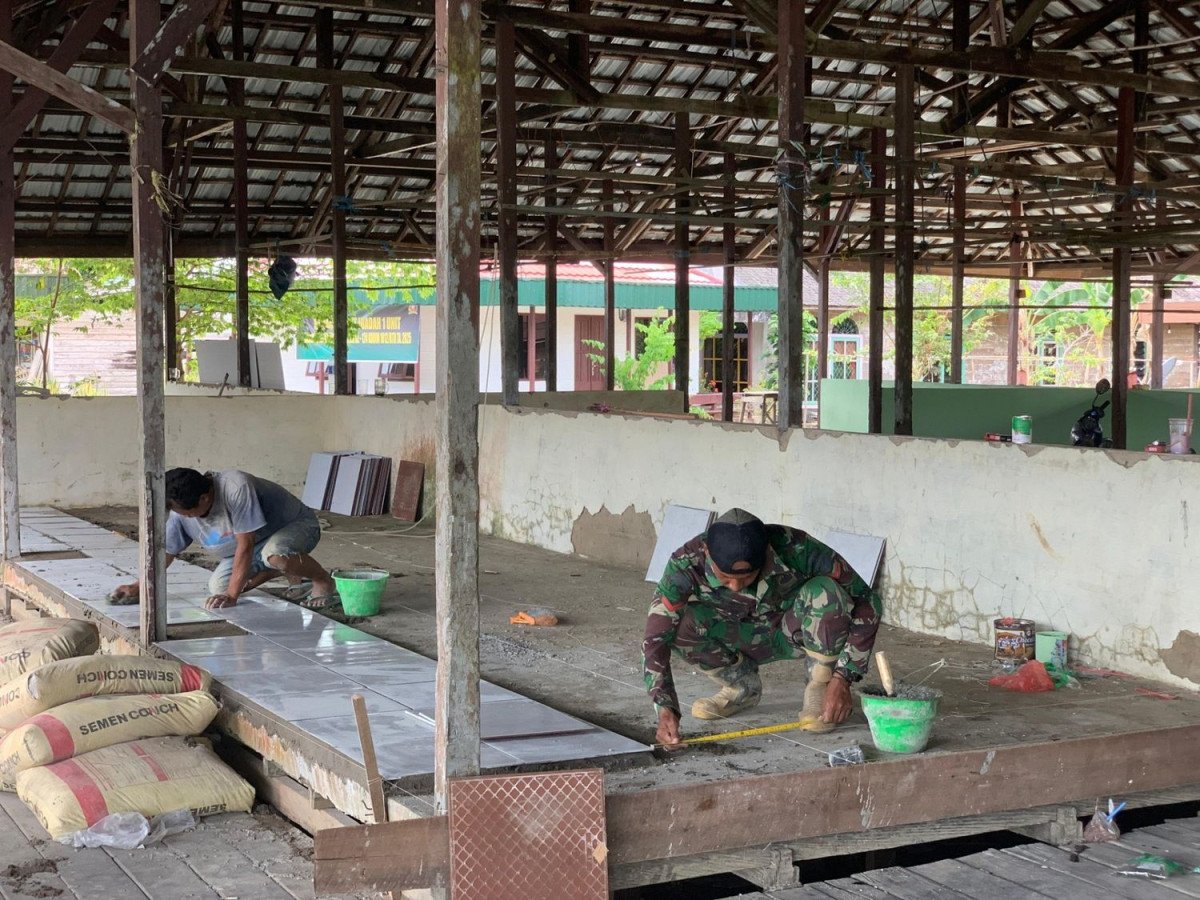 Barito Selatan – Pemasangan keramik di Pasar Desa Talio, Kecamatan Karau Kuala, Kabupaten Barito Selatan, terus berjalan dengan lancar dan signifikan. Saat ini, hampir separuh lantai pasar telah tertutup keramik, menandai kemajuan pesat dalam proyek pembangunan yang menjadi bagian dari kegiatan TMMD Ke-124 Kodim 1012/Buntok.