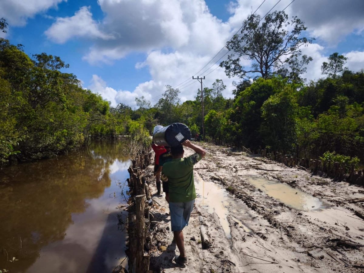 Pengangkutan Material Dilakukan Satgas Secara Manual Oleh Satgas