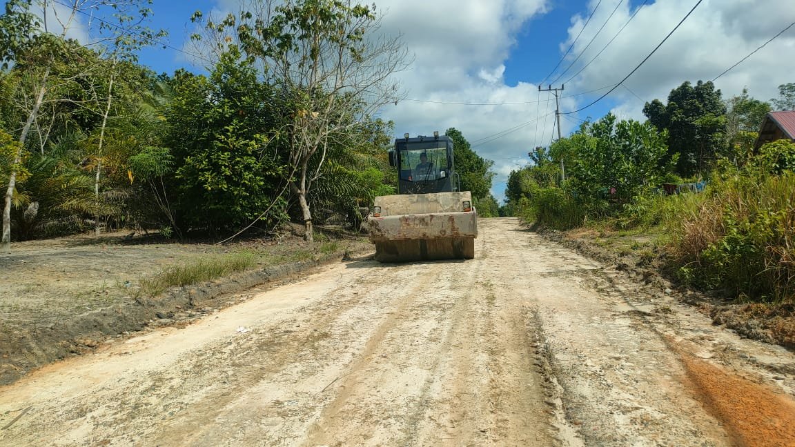 Pemadatan badan jalan dilakukan menggunakan alat berat jenis wales untuk memastikan struktur jalan kuat dan tahan lama. Ini merupakan tahapan penting sebelum jalan benar-benar bisa digunakan oleh masyarakat setempat.
