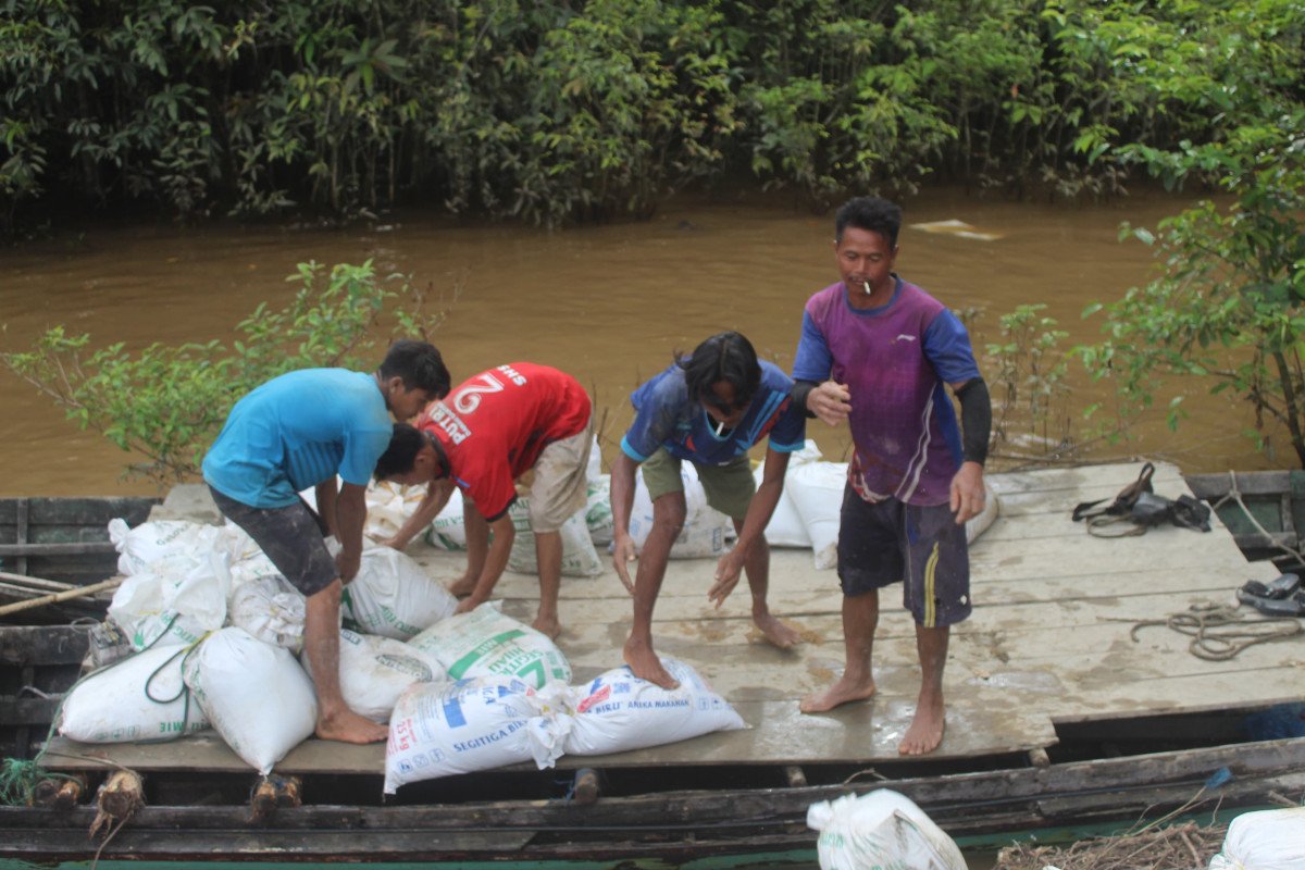Medan yang sulit dilalui kendaraan membuat distribusi material tidak bisa dilakukan langsung menggunakan alat berat. Sebagai solusi, material bangunan dipindahkan secara manual, dimasukkan ke dalam karung, lalu dipanggul ke titik pengecoran yang berjarak cukup jauh dari titik bongkar.