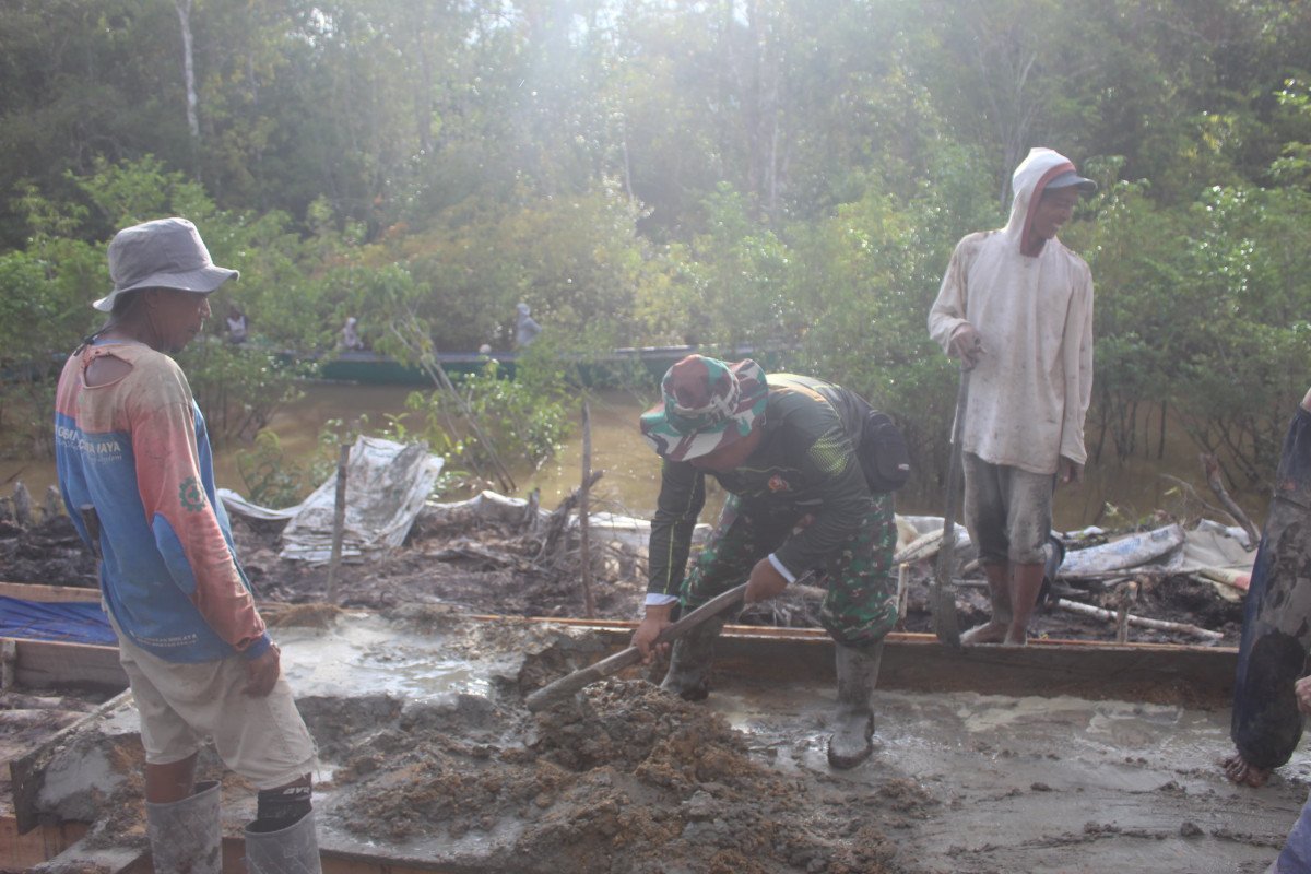 Dalam kegiatan ini, adukan semen, pasir, dan kerikil diolah langsung di lokasi menggunakan molen, lalu dituang dan diratakan secara manual. Meskipun pekerjaan cukup berat, semangat para personel dan warga tetap tinggi, bahkan di tengah terik matahari.