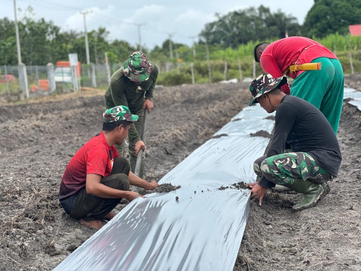 Pada kegiatan ini, anggota Satgas TMMD secara aktif memasang plastik mulsa sebagai pelindung lahan dari gulma dan penguapan air berlebih. Plastik mulsa ini juga membantu menjaga suhu tanah agar lebih stabil, sehingga tanaman dapat tumbuh optimal dan produktivitas pertanian meningkat.