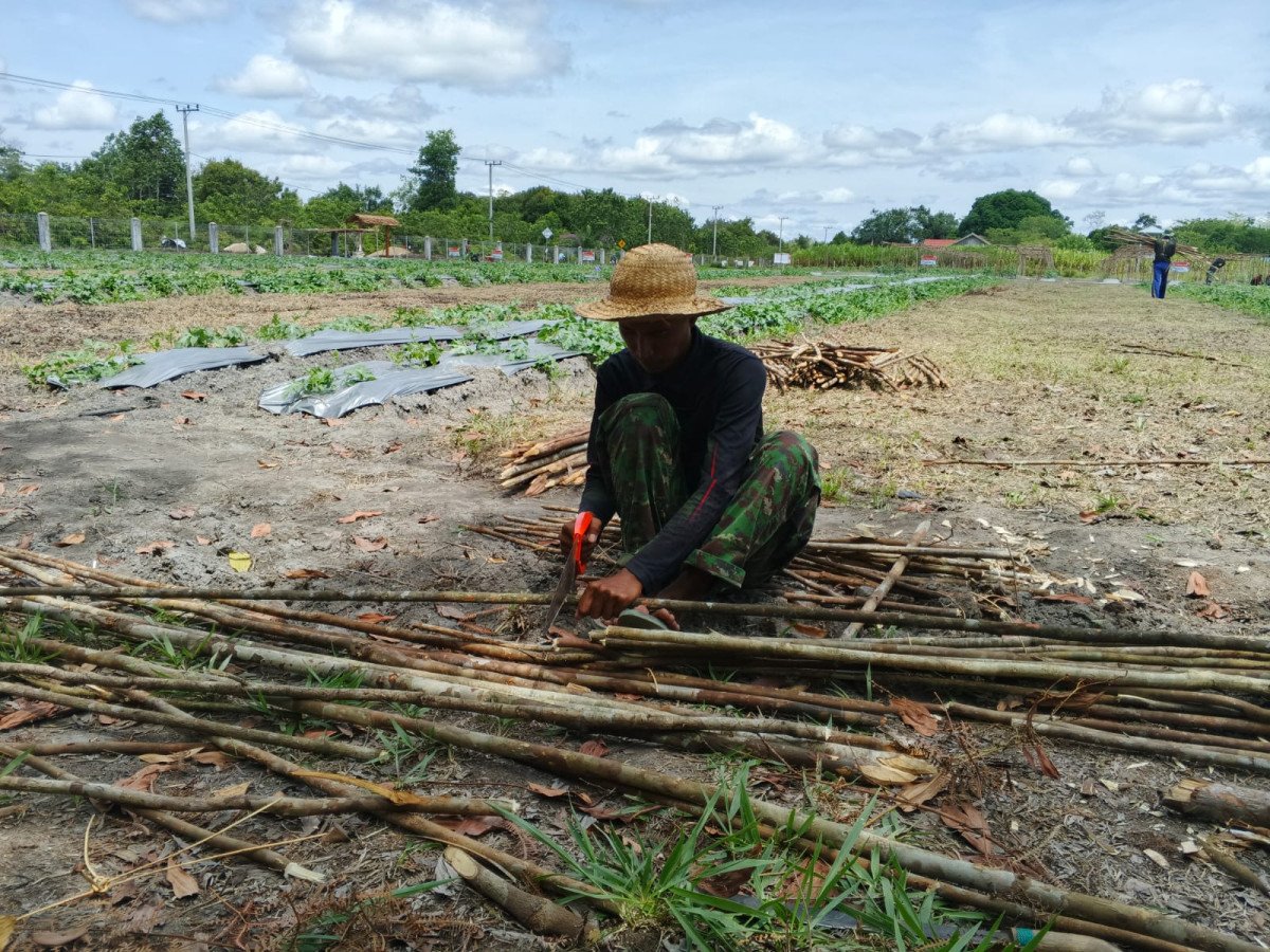 Pemotongan kayu rambatan dilakukan untuk memberi ruang bagi tanaman sayuran agar tumbuh lebih baik dan hasil panen meningkat. Kayu-kayu yang sudah tua atau rusak dipangkas secara hati-hati oleh anggota Satgas bersama warga setempat, sehingga tanaman rambatan bisa lebih kuat dan produktif.