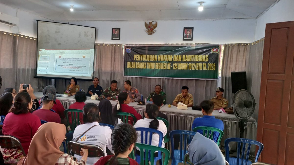 Barito Selatan – Satgas TNI Manunggal Membangun Desa (TMMD) Reguler ke-124 Kodim 1012/Buntok menggandeng Polres Barito Selatan dalam memberikan penyuluhan hukum dan keamanan serta ketertiban masyarakat (Kamtibmas) di Balai Desa Talio, Kecamatan Karau Kuala, Kabupaten Barito Selatan, Pada hari Selasa (27/05/2025)