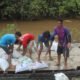 Material seperti semen, pasir, dan batu kerikil diturunkan secara manual dari truk pengangkut. Satgas dan warga membentuk barisan estafet, mengoper karung dan ember satu per satu agar proses bongkar muatan berlangsung cepat dan efisien meskipun tanpa alat berat.